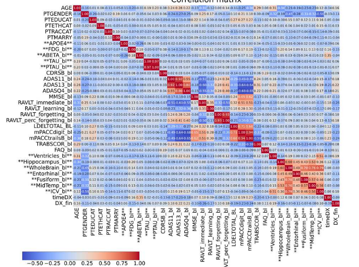 Features with more than 33% missing values were removed, while remaining missing data were imputed using a k-Nearest Neighbors approach. Exploratory analysis was performed through correlation matrices to investigate relationships between biomarkers.